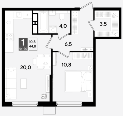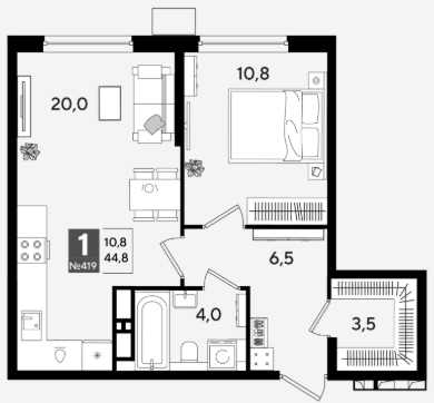 1 | 44.8 / 10.8 м² | от 7 835 519 руб. (174 900 руб./м²) | Планировка | |