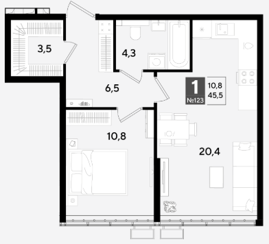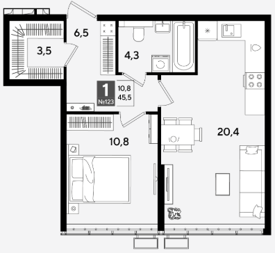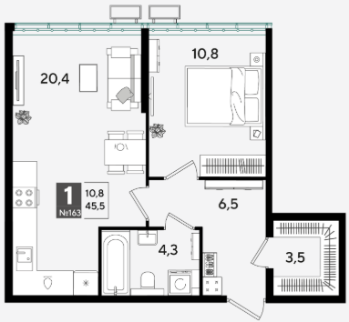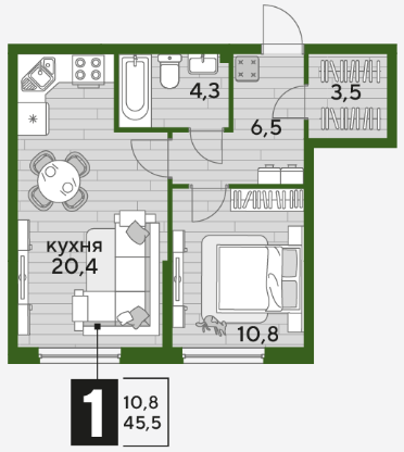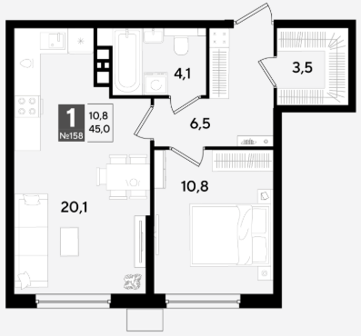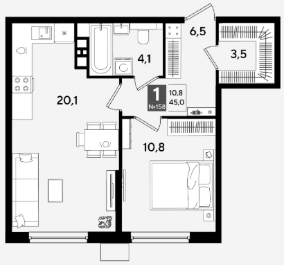 1 | 44.8 / 10.8 м² | от 8 158 079 руб. (182 100 руб./м²) | Планировка | |