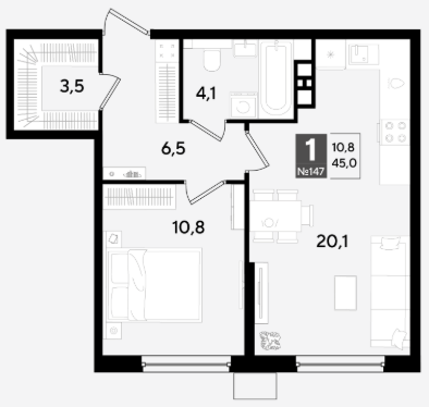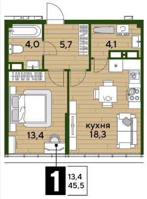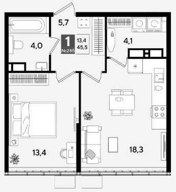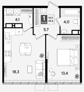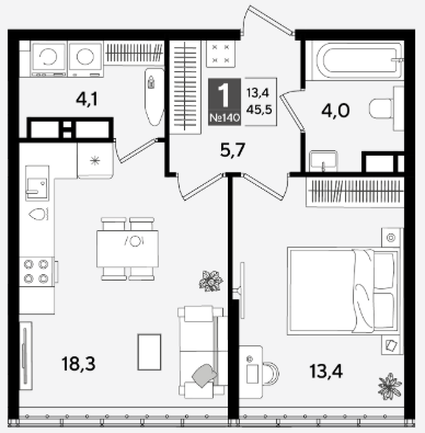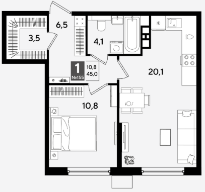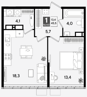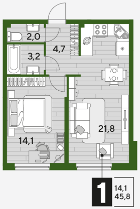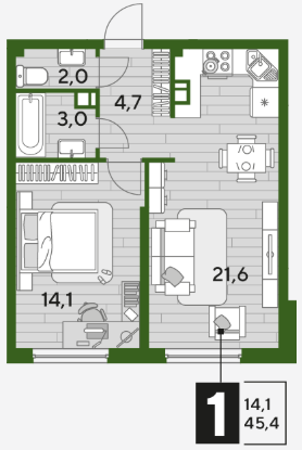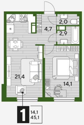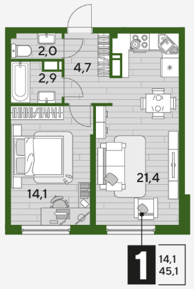 1 | 45.1 / 14.1 м² | от 7 915 050 руб. (175 500 руб./м²) | Планировка | |