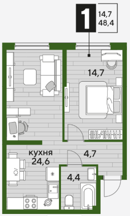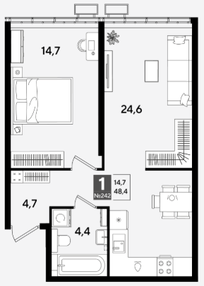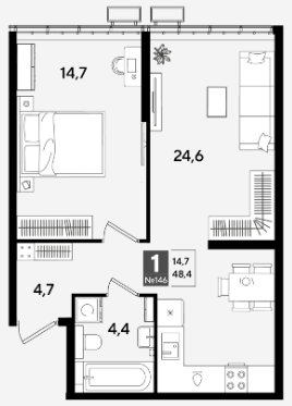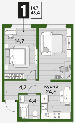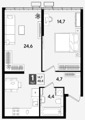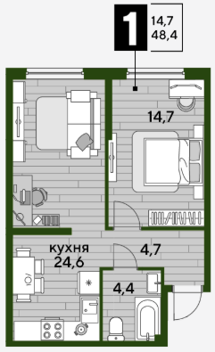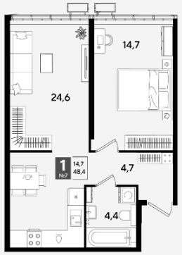 1 | 48.3 / 14.4 м² | от 7 837 110 руб. (162 259 руб./м²) | Планировка |