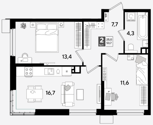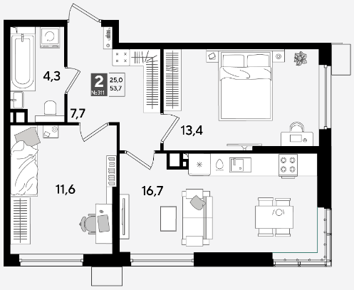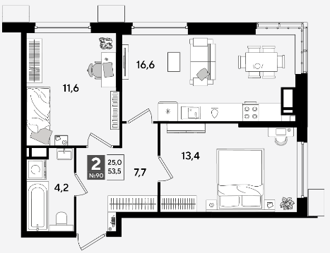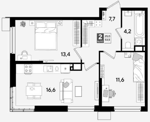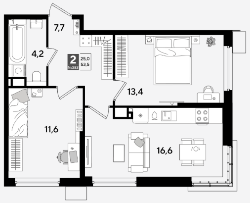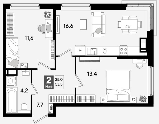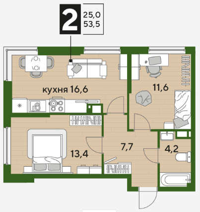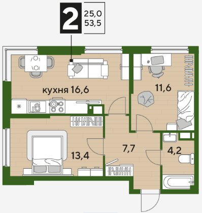 2 | 53.5 / 25.0 м² | от 8 693 750 руб. (162 500 руб./м²) | Планировка |