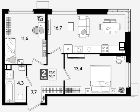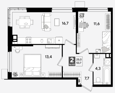 2 | 53.7 / 25 м² | от 8 531 570 руб. (158 875 руб./м²) | Планировка | |