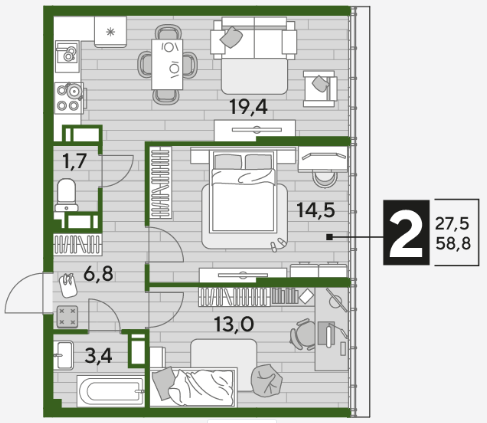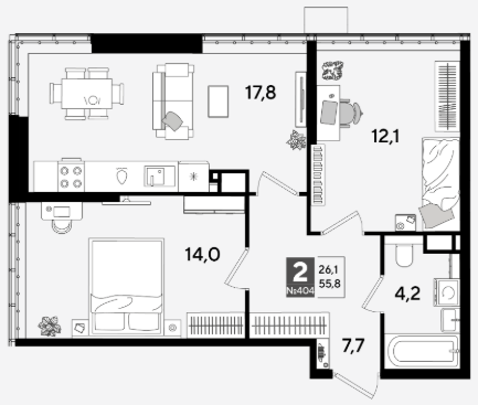 2 | 59.3 / 25.8 м² | от 9 055 110 руб. (152 700 руб./м²) | Планировка |