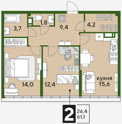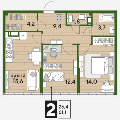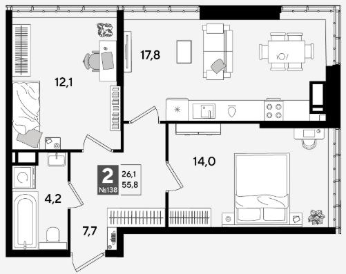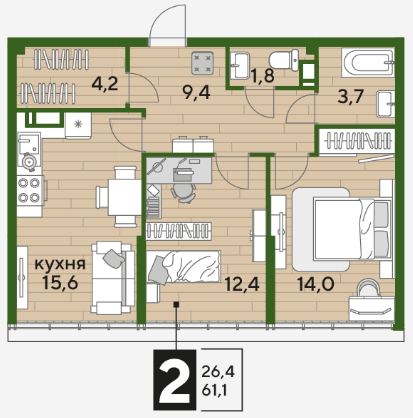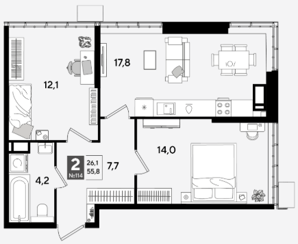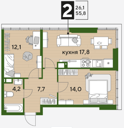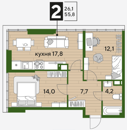 2 | 55.8 / 26.1 м² | от 9 006 120 руб. (161 400 руб./м²) | Планировка | |