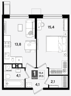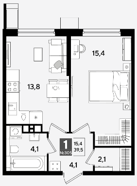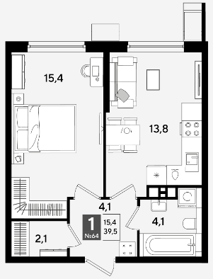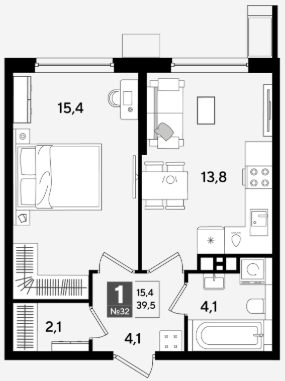 1 | 39.5 / 15.4 м² | от 7 208 750 руб. (182 500 руб./м²) | Планировка | |