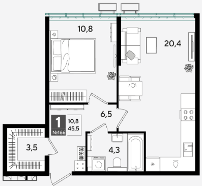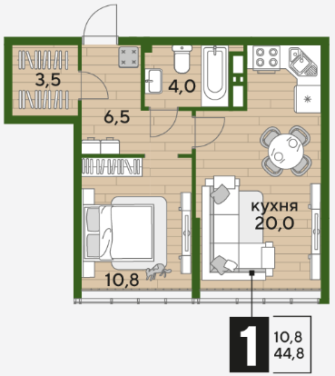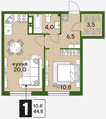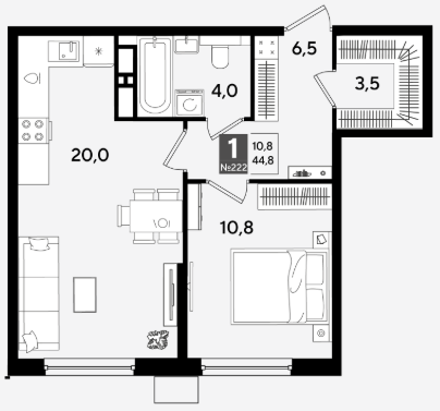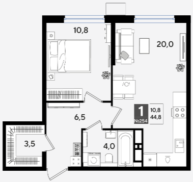 1 | 44.8 / 10.8 м² | от 6 137 600 руб. (137 000 руб./м²) | Планировка | |