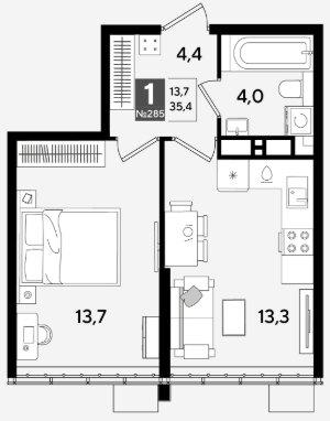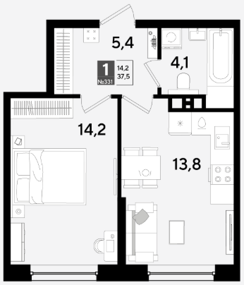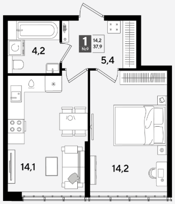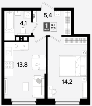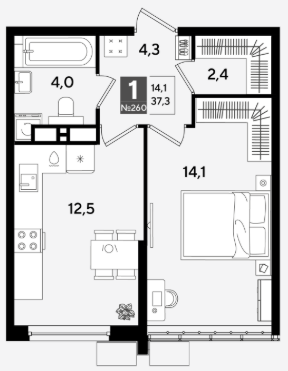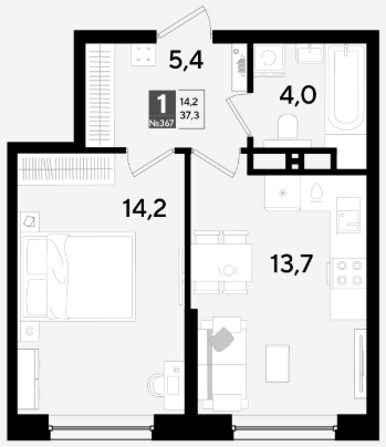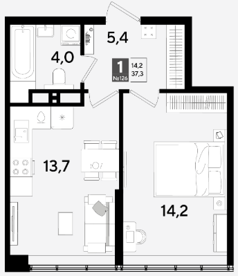 1 | 37.3 / 14.2 м² | от 7 019 859 руб. (188 200 руб./м²) | Планировка | |