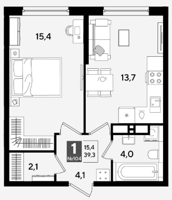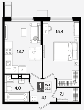 1 | 39.3 / 15.4 м² | от 7 003 259 руб. (178 200 руб./м²) | Планировка |