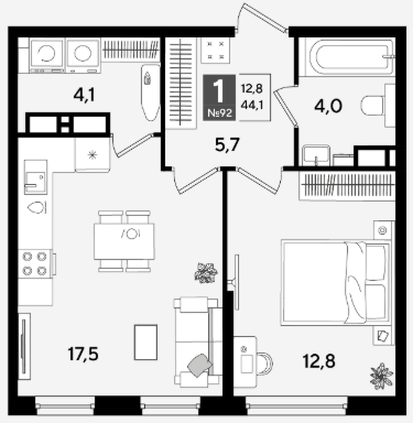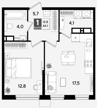 1 | 44.1 / 12.8 м² | от 7 880 670 руб. (178 700 руб./м²) | Планировка | |