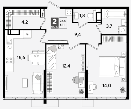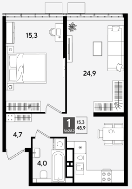 1 | 39.3 / 15.4 м² | от 7 176 179 руб. (182 600 руб./м²) | Планировка | |