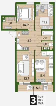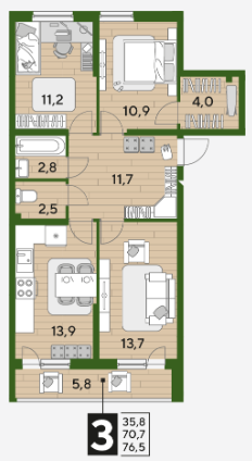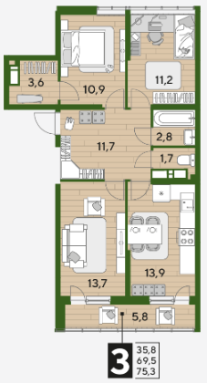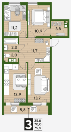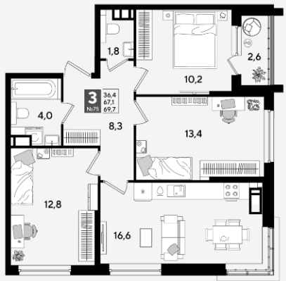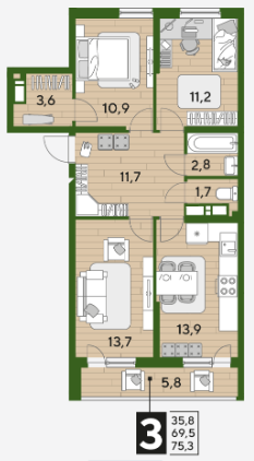 3 | 75.3 / 35.8 м² | от 10 946 880 руб. (145 377 руб./м²) | Планировка |