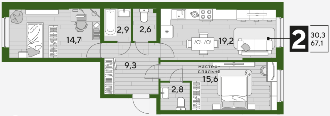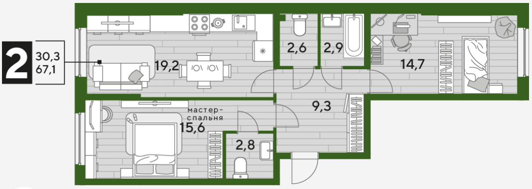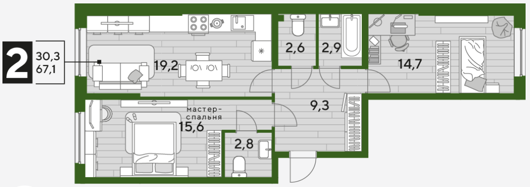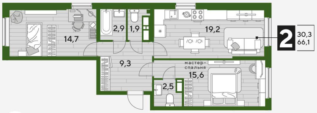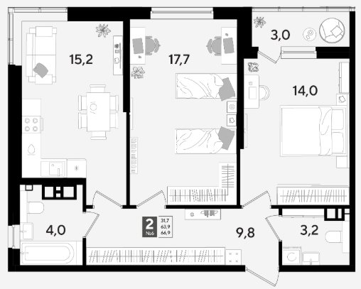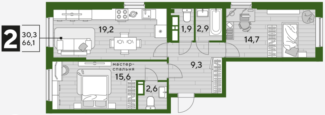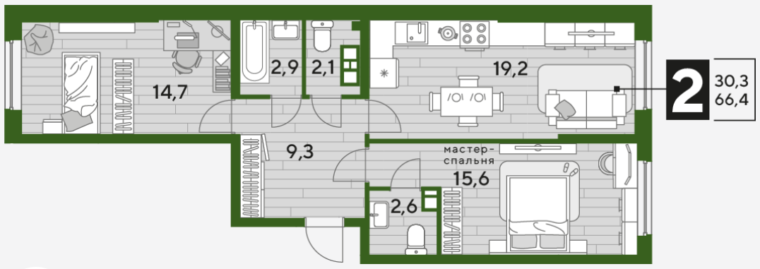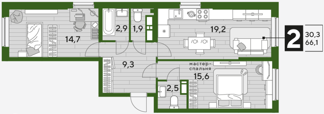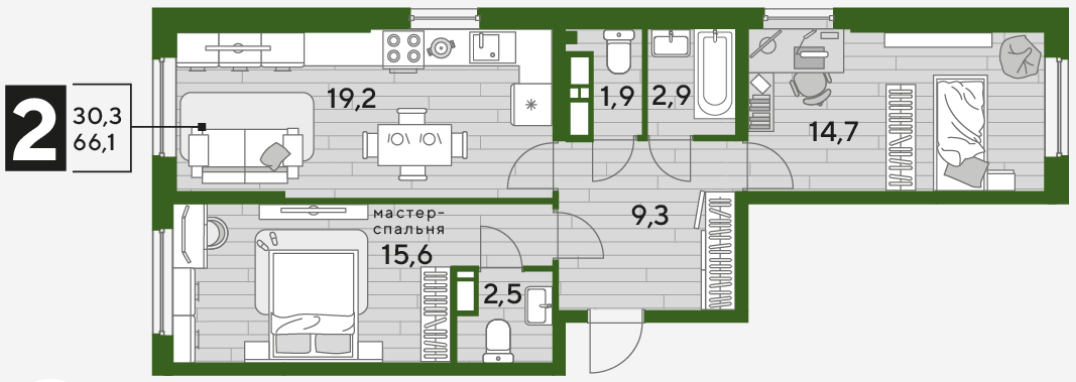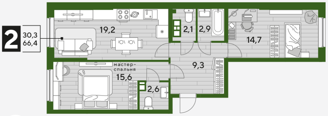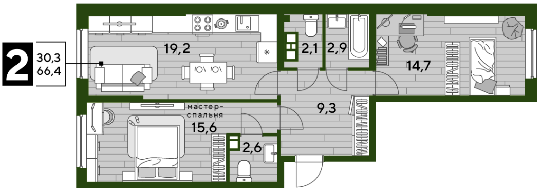 2 | 66.1 / 30.3 м² | от 10 252 110 руб. (155 100 руб./м²) | Планировка | |
