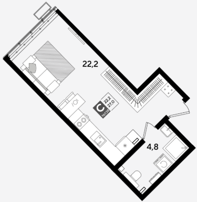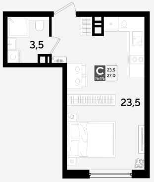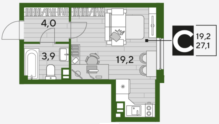 студия | 27.1 / 19.2 м² | от 5 476 910 руб. (202 100 руб./м²) | Планировка | |