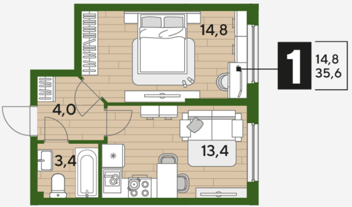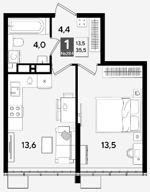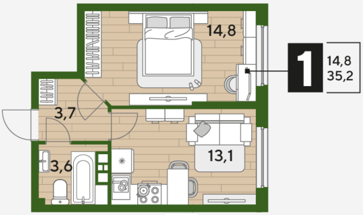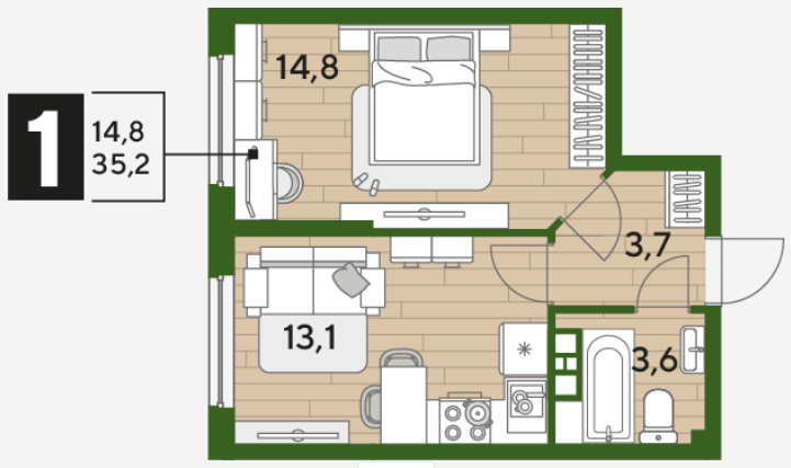 1 | 35.2 / 14.8 м² | от 6 504 960 руб. (184 800 руб./м²) | Планировка | |