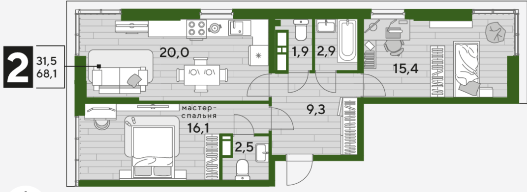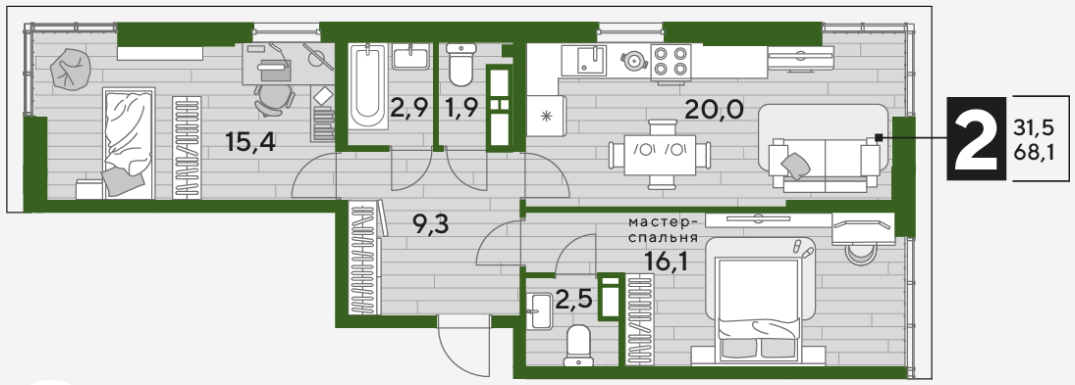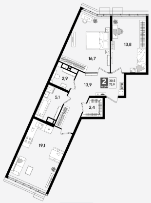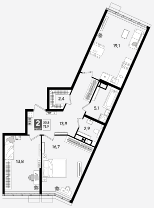 2 | 73.9 / 30.5 м² | от 11 513 620 руб. (155 800 руб./м²) | Планировка |
