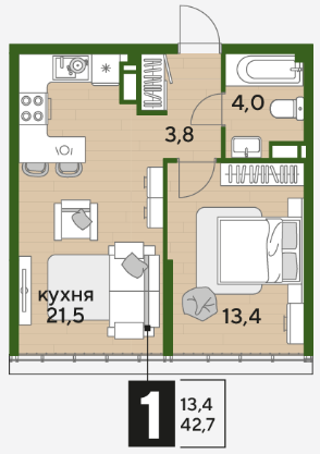 1 | 42.0 / 12.8 м² | от 7 576 800 руб. (180 400 руб./м²) | Планировка | |