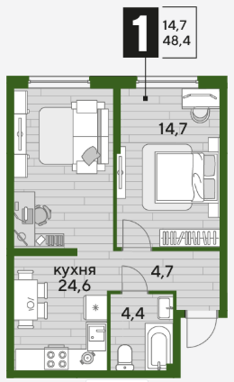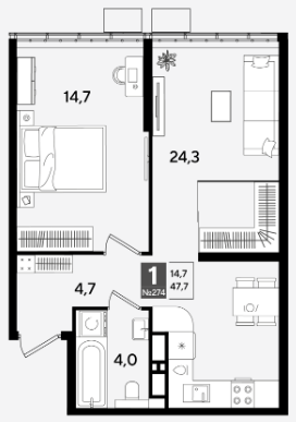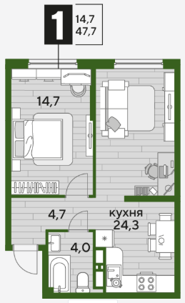 1 | 47.7 / 14.7 м² | от 8 070 840 руб. (169 200 руб./м²) | Планировка | |