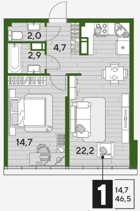 1 | 46.5 / 14.7 м² | от 7 905 000 руб. (170 000 руб./м²) | Планировка | |