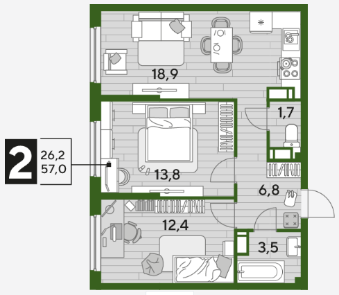 2 | 57.0 / 26.2 м² | от 8 920 500 руб. (156 500 руб./м²) | Планировка |