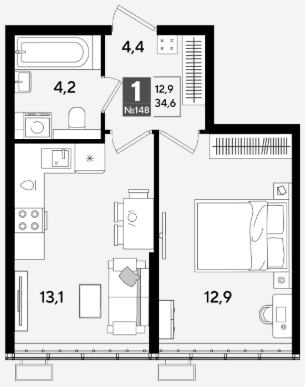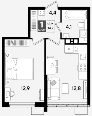 1 | 34.2 / 12.9 м² | от 6 583 500 руб. (192 500 руб./м²) | Планировка | |