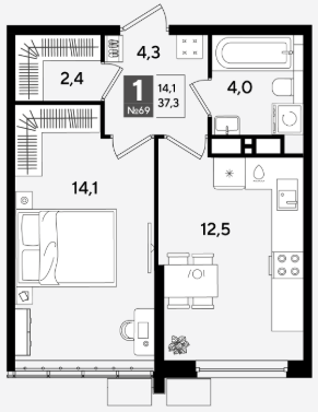 1 | 37.3 / 14.1 м² | от 6 881 849 руб. (184 500 руб./м²) | Планировка | |
