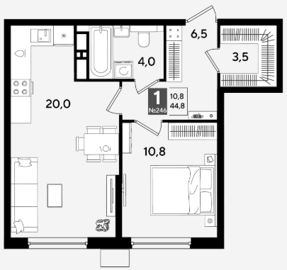 1 | 44.8 / 10.8 м² | от 7 992 319 руб. (178 400 руб./м²) | Планировка | |