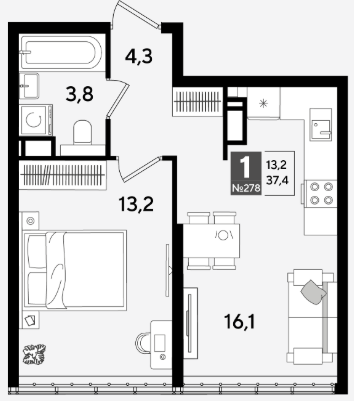 1 | 37.4 / 13.2 м² | от 7 270 560 руб. (194 400 руб./м²) | Планировка | |