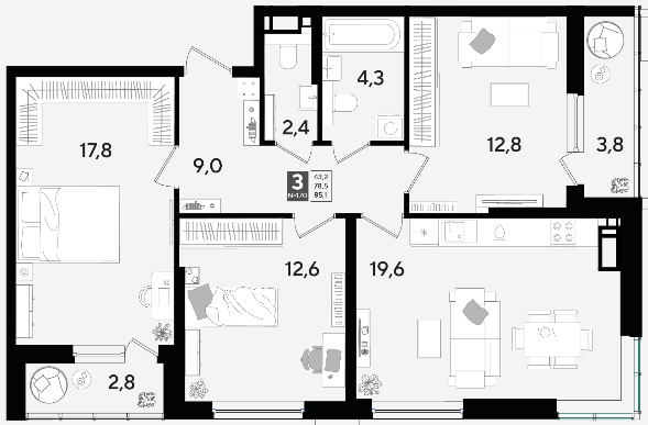 3 | 85.1 / 43.2 м² | от 10 382 200 руб. (122 000 руб./м²) | Планировка |