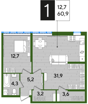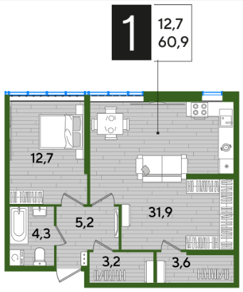 1 | 60.9 / 12.7 м² | от 9 214 170 руб. (151 300 руб./м²) | Планировка | |