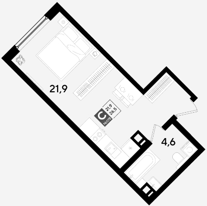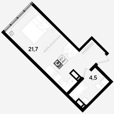 студия | 26.2 / 21.7 м² | от 5 399 820 руб. (206 100 руб./м²) | Планировка | |