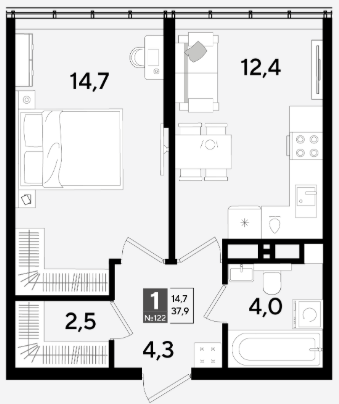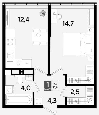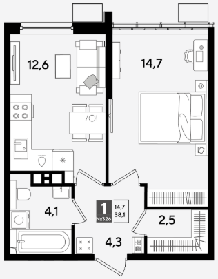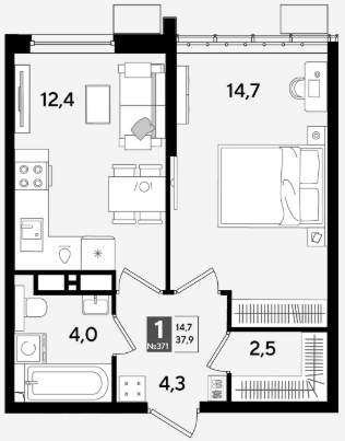 1 | 37.9 / 14.7 м² | от 7 136 570 руб. (188 300 руб./м²) | Планировка | |
