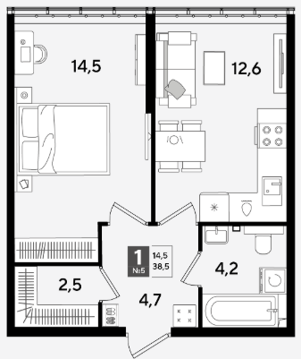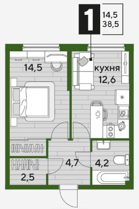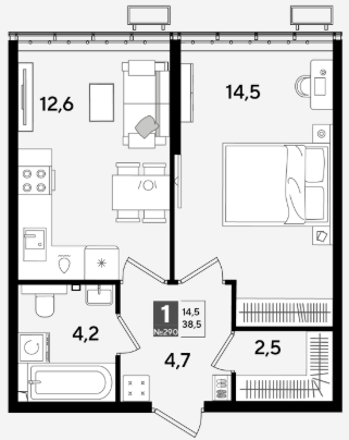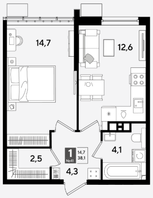 1 | 38.5 / 14.5 м² | от 6 687 450 руб. (173 700 руб./м²) | Планировка |