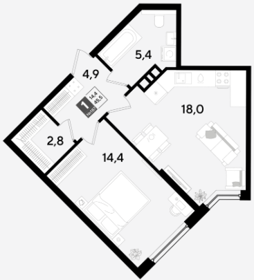 1 | 45.2 / 14.4 м² | от 7 864 800 руб. (174 000 руб./м²) | Планировка | |