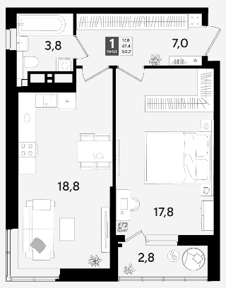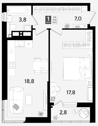1 | 50.2 / 17.8 м² | от 6 877 400 руб. (137 000 руб./м²) | Планировка | |
