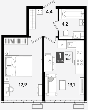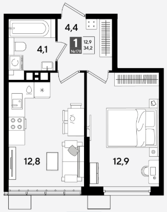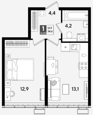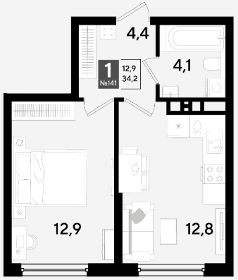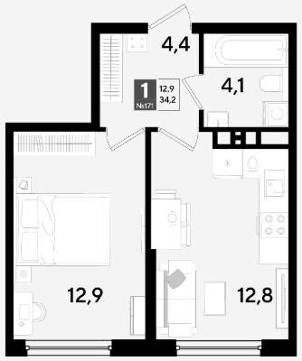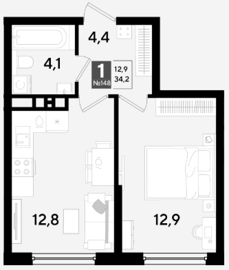 | 1 | 34.2 / 12.9 м² | от 6 583 500 руб. (192 500 руб./м²) | Планировка | |