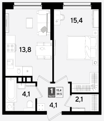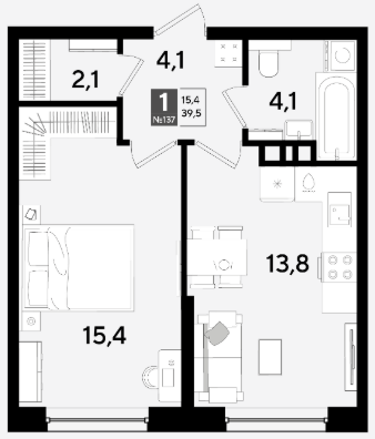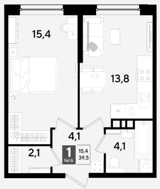 | 1 | 39.5 / 15.4 м² | от 7 133 700 руб. (180 600 руб./м²) | Планировка | |