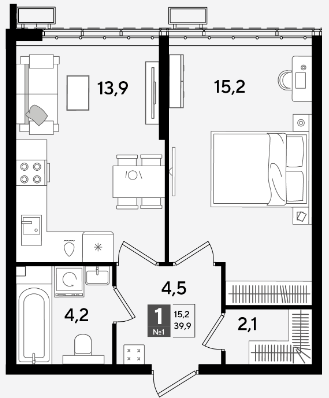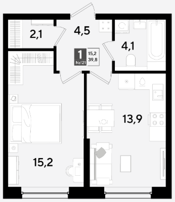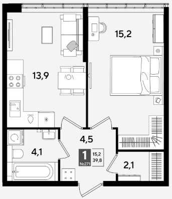 | 1 | 39.8 / 15.2 м² | от 7 418 719 руб. (186 400 руб./м²) | Планировка | |