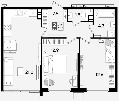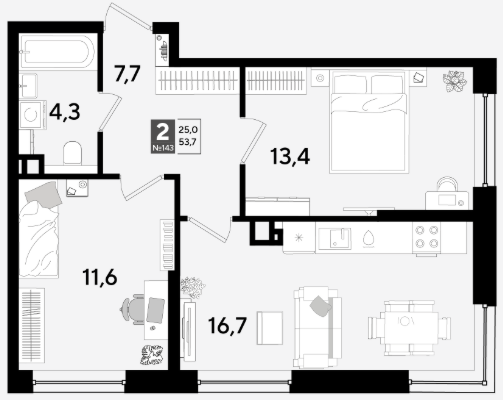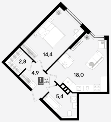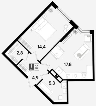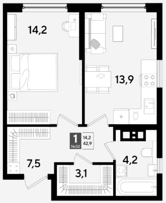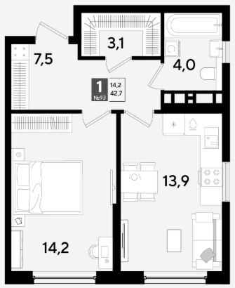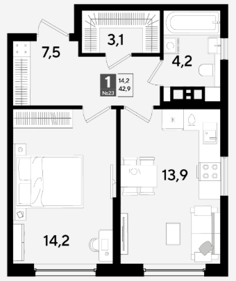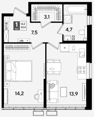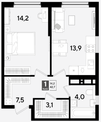 | 1 | 42.9 / 14.2 м² | от 7 709 130 руб. (179 700 руб./м²) | Планировка | |
