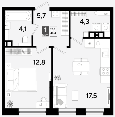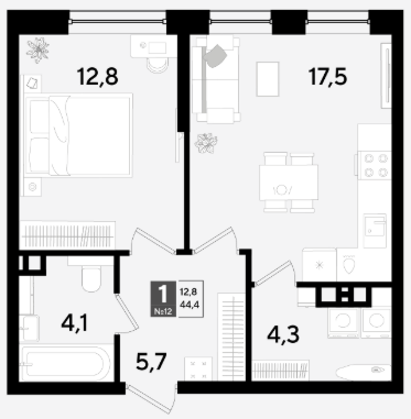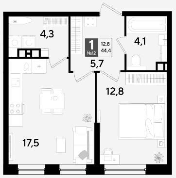 | 1 | 44.4 / 12.8 м² | от 7 587 960 руб. (170 900 руб./м²) | Планировка | |