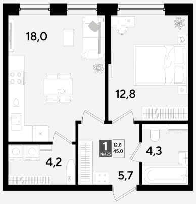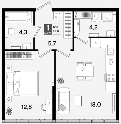 | 1 | 45.0 / 12.8 м² | от 7 960 500 руб. (176 900 руб./м²) | Планировка | |