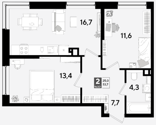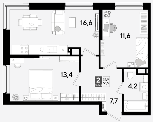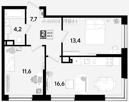 | 2 | 53.5 / 25.0 м² | от 8 693 750 руб. (162 500 руб./м²) | Планировка |