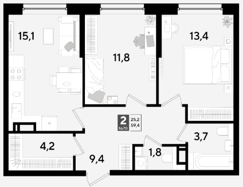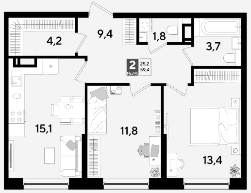 | 2 | 59.4 / 25.2 м² | от 9 141 660 руб. (153 900 руб./м²) | Планировка | |