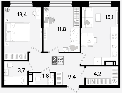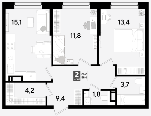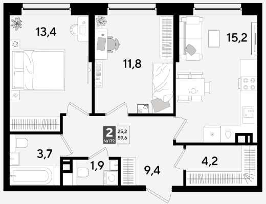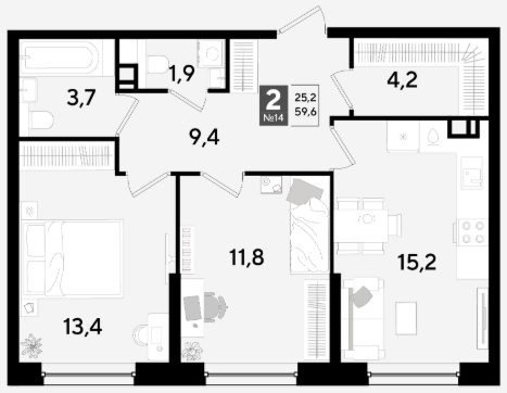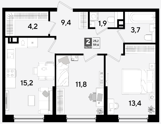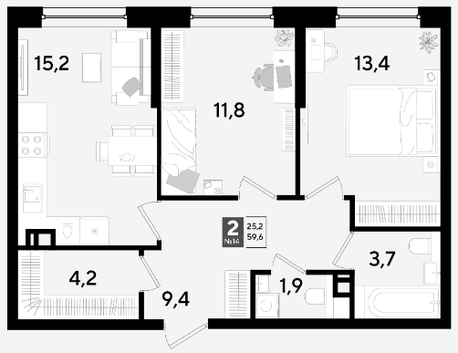| 2 | 59.6 / 25.2 м² | от 9 106 020 руб. (152 786 руб./м²) | Планировка | |