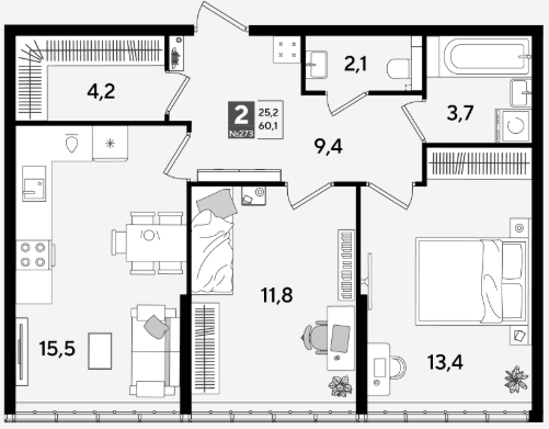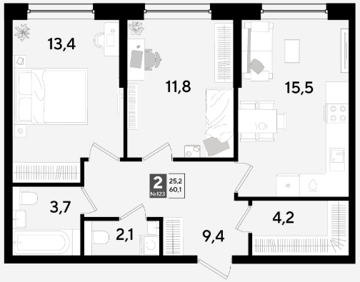 | 2 | 60.1 / 25.2 м² | от 9 231 360 руб. (153 600 руб./м²) | Планировка | |