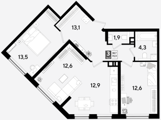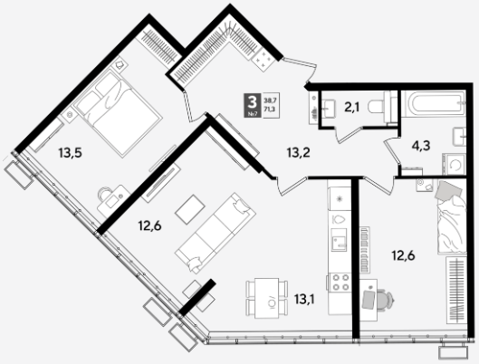 | 1 | 38.3 / 12.7 м² | от 7 108 479 руб. (185 600 руб./м²) | Планировка | |