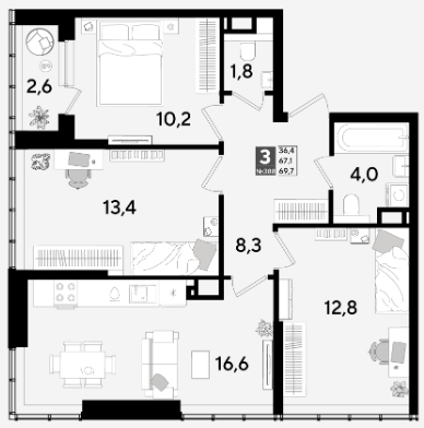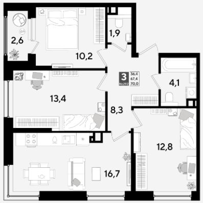 | 3 | 69.7 / 36.6 м² | от 9 716 180 руб. (139 400 руб./м²) | Планировка |