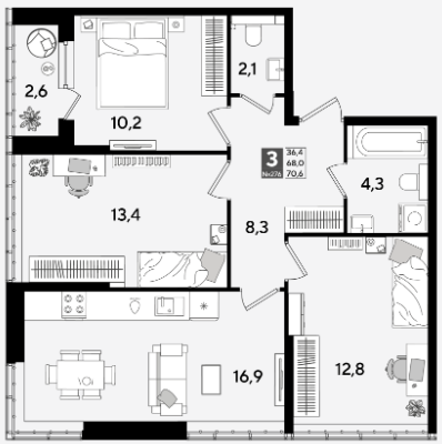| 3 | 70.6 / 36.4 м² | от 9 763 980 руб. (138 300 руб./м²) | Планировка |