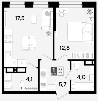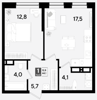 | 1 | 44.1 / 12.8 м² | от 7 801 290 руб. (176 900 руб./м²) | Планировка | |