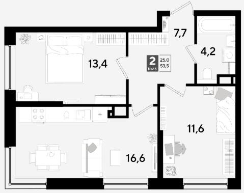 | 2 | 66.6 / 31.7 м² | от 8 458 200 руб. (127 000 руб./м²) | Планировка | |