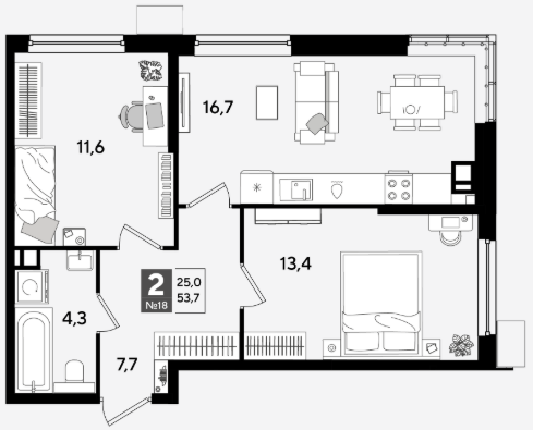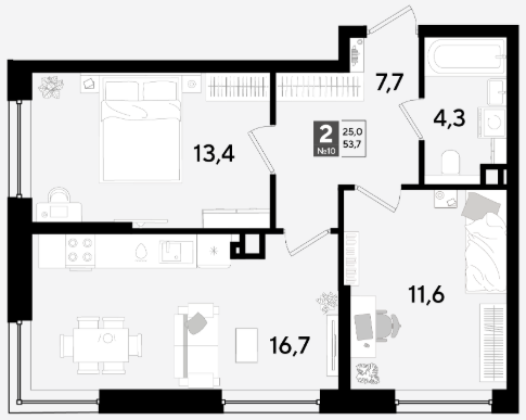 | 2 | 53.7 / 25 м² | от 8 565 150 руб. (159 500 руб./м²) | Планировка | |